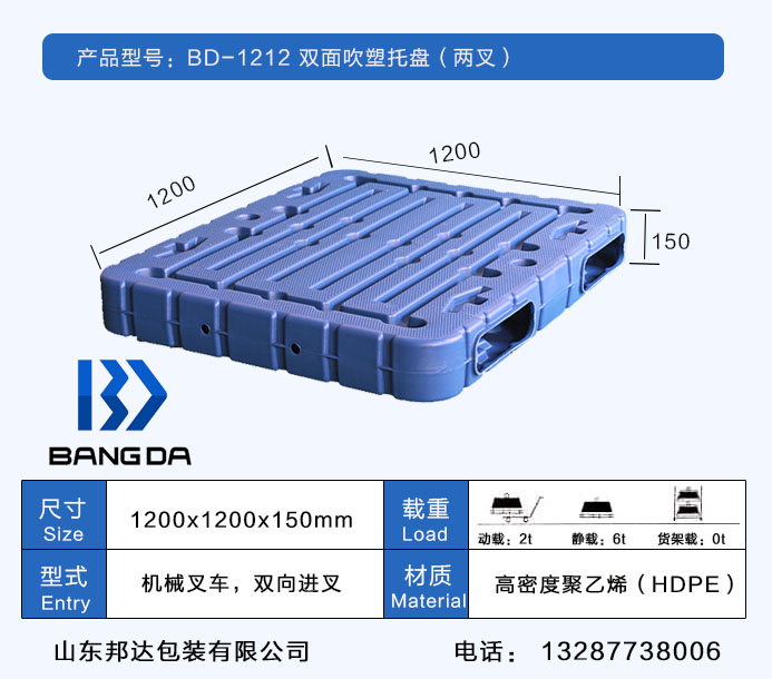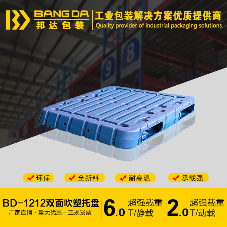 BD-1212雙面塑料吹塑托盤尺寸為1200*1200*150(mm),采用國內(nèi)最先進(jìn)的吹塑技術(shù),原材料采用的是HDPE一種結(jié)晶度高,非極性的熱塑性樹脂;邦達(dá)的雙面塑料托盤承載強(qiáng),耐高溫且環(huán)保;山東邦達(dá)包裝有限公司承諾旗下所有的產(chǎn)品均此采用全新材料,廠家直銷,正規(guī)發(fā)票,量大優(yōu)惠!