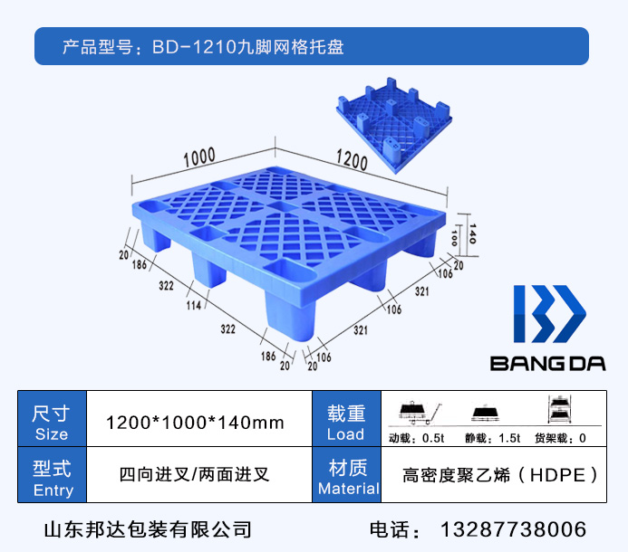 山東邦達包裝有限公司九腳塑料托盤系列型號尺寸有: