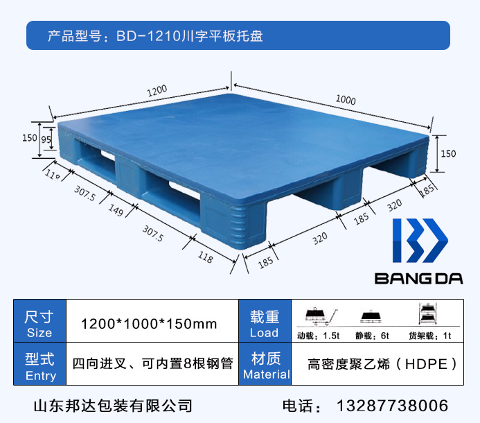 山東邦達川字平板塑料托盤的主要材質是全新料HDPE,耐高溫,承重力強,抗砸抗摔,川字托盤四面進叉,適合平地、堆垛、貨架使用;主要適用于叉車運輸和墊倉板,能提高整個物流倉儲系統的作業效率,對儲運軟質紙箱時能有效減少破損率;廣泛用于倉儲、汽車配件、機電機械、食品飲料、電子、煙草、醫藥、化工、紡織等行業。