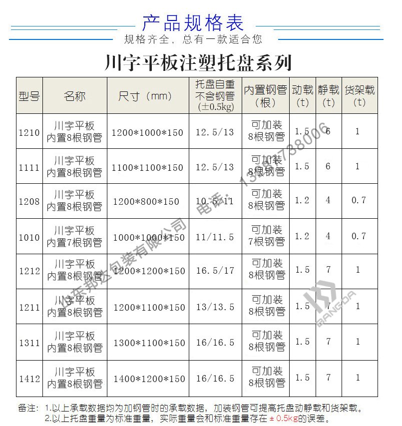 山東邦達川字平板塑料托盤系列尺寸主要有: